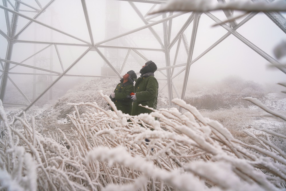 12月12日,國網(wǎng)運(yùn)城供電公司員工在110千伏金古線固定觀冰哨開展線路覆冰觀測。